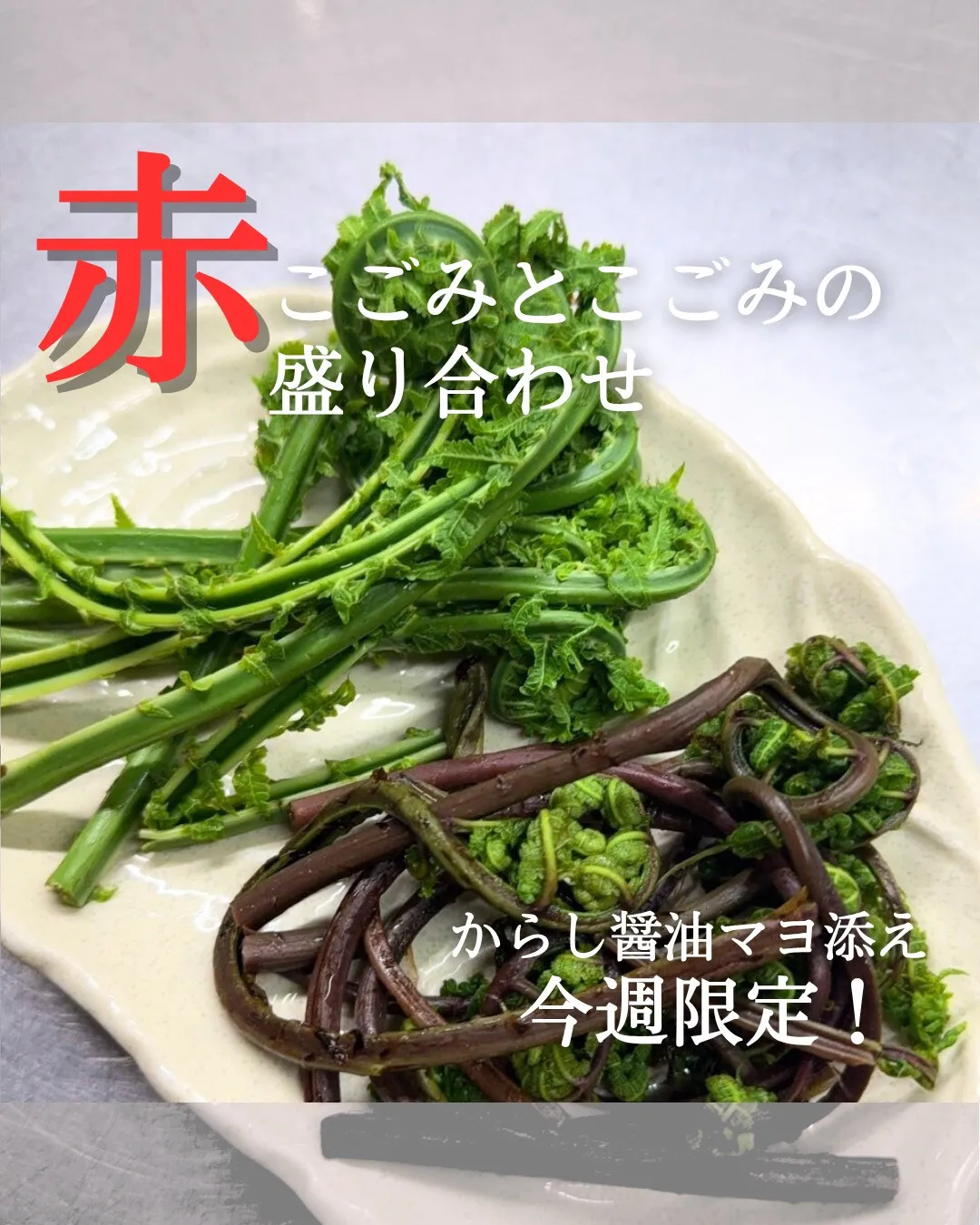 . .【今週限定🌿】 “赤こごみ”と“こごみ”の盛り合わせが登場✨ 山菜ならではのシャキッとした食感と、ほろ苦さがクセになる… からし醤油マヨを添えて、大人の味わいに仕上げました😌旬の恵みをぜひご堪能くだ…